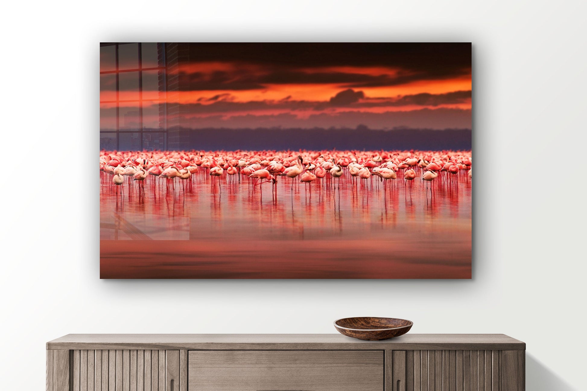 Pink Flamingos, Ocean Sunset, Large Glass Wall Art